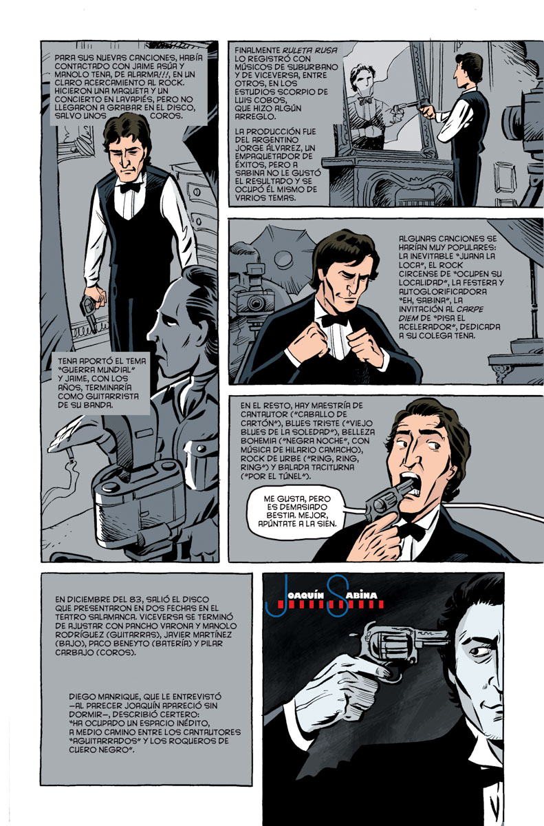 Es que Sabina tiene una narrativa muy novelesca en muchas de sus canciones; las estrofas y estribillos se ven. Así que trasladarlo a viñetas ha sido algo muy agradecido. Hemos procurado, en las páginas que recrean canciones, no usar apenas la letra de la canción, pero el lector la va a reconocer enseguida, la va a poder cantar viendo las ilustraciones.