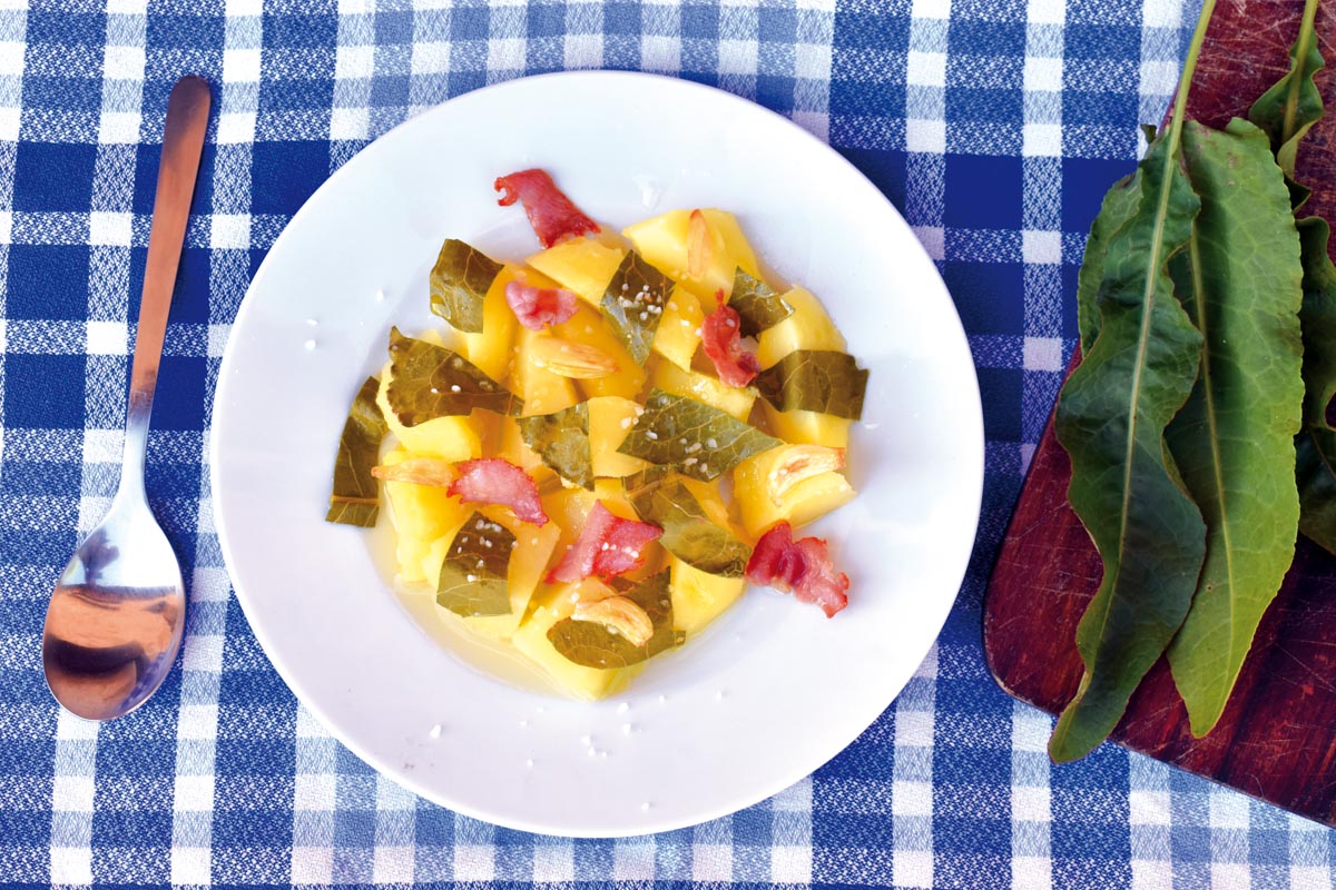 La receta es tan sencilla como cocer patatas previamente peladas y troceadas y, tras su cocción, añadirles un sofrito a base de jamón, ajo silvestre y hojas de acedera partidas en trozos.